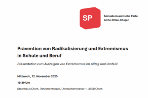 Prävention von Radikalisierung und Extremismus in Schule und Beruf Eine Präsentation zum Aufzeigen von Extremismus im Alltag und Umfeld, organisiert von der SP Amtei Olten-Gösgen Wann: Mittwoch, 12. November 2025