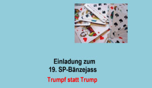 Einladung zum 19. SP-Bänzejass Trumpf statt TrumpFreitag, 28. November 2025, 20.00 Uhr (Spielbeginn), im Rest. Jurablick, Gretzenbach Es sind alle herzlich eingeladen. Die ersten Fünf erhalten einen währschaften “Bänz”, deroder