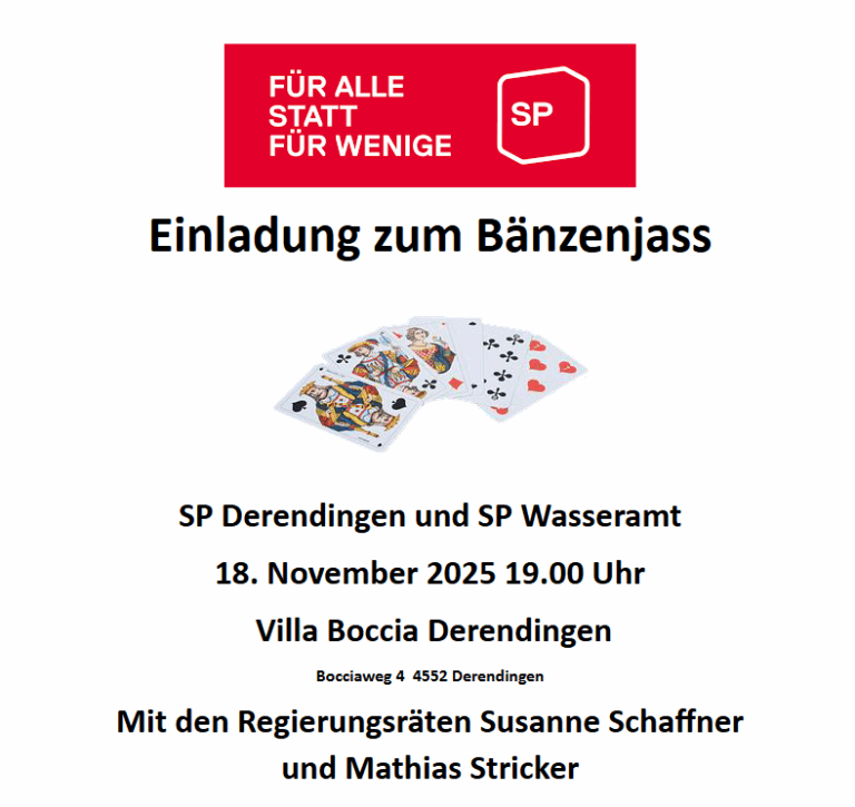 Bänzejass mit mit den Regierungsräten Susanne Schaffner und Mathias Stricke Die SP Derendingen und die SP Wasseramt laden euch herzlich zum Bänzejass am Dienstag, 18. November 2025 in Derendingen ein. Anmeldung
